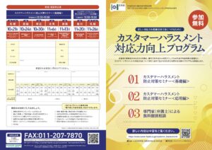 北海道の事業者のみなさまを対象に、基本方針作成から対応マニュアルの作成や相談体制の整備など、 カスタマーハラスメントの対処方法について学び、 社内で生かせる対応力を高める充実のプログラムを実施します。
