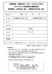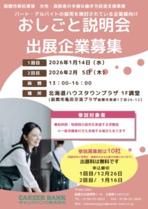 1 開催日時 1回目:令和8年1月14日(水)13:00~16:00 2回目:令和8年2月 5日(木)13:00~16:00 2 会場 北海道ハウスタウンプラザ(亀田交流プラザ) 1階講堂1 3 参加対象者 短時間・短期間の就労を希望する求職者 4 申込み先 別添チラシ裏面「参加申込書(FAX)」または電話・メールでも申込み可能です。 メールアドレス hakodatejigyou@career-bank.co.jp 5 申込み締切 1回目:令和7年12月26日 2回目:令和8年1月16日